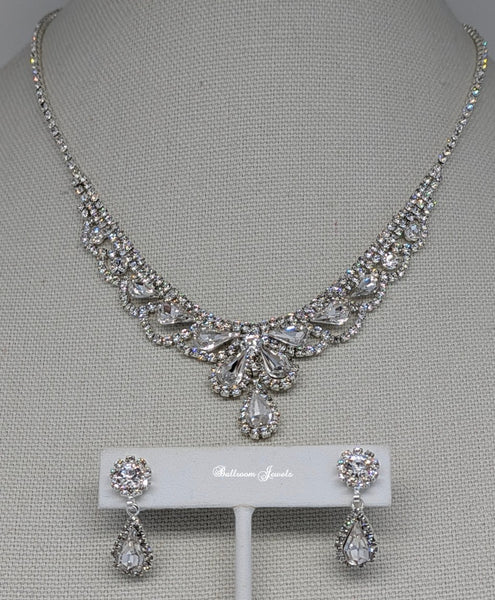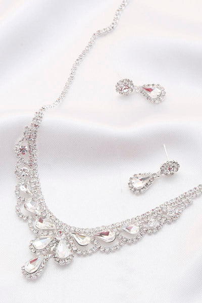 This petite necklace set includes an adjustable necklace with a 3 inch adjustment. It starts at 16 inches, and the drop in the front drops approximately 1 inch